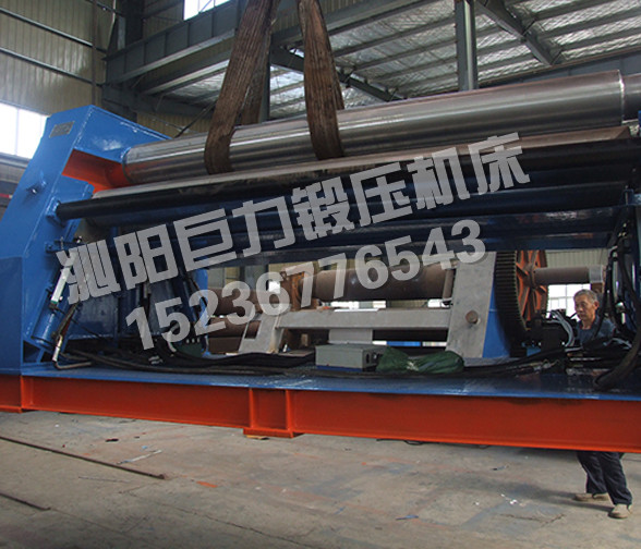 Compared with the symmetrical three-roll plate winding machine, the four-roll plate winding machine can bend the end of the plate directly without the aid of other equipments and dies, and the remaining straight edge is smaller; it can make the plate turn into a workpiece without turning the head.