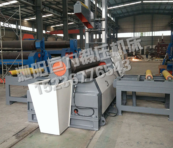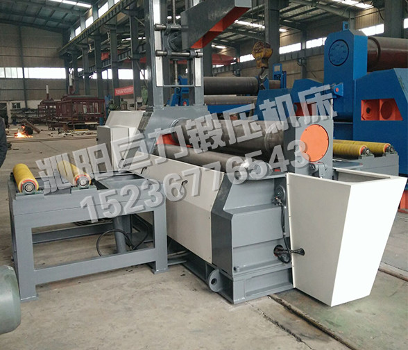 Compared with the symmetrical three-roll plate winding machine, the four-roll plate winding machine can bend the end of the plate directly without the aid of other equipments and dies, and the remaining straight edge is smaller; it can make the plate turn into a workpiece without turning the head.