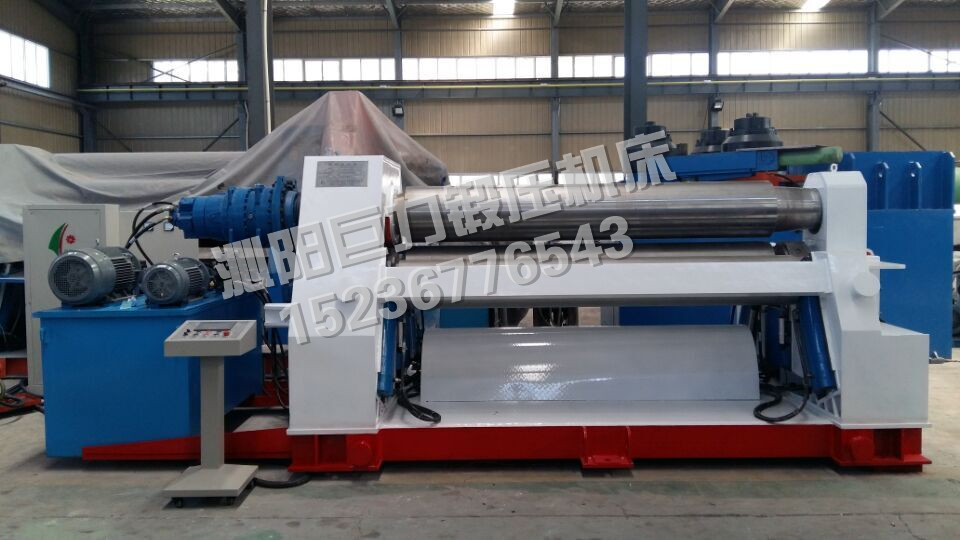 Compared with the symmetrical three-roll plate winding machine, the four-roll plate winding machine can bend the end of the plate directly without the aid of other equipments and dies, and the remaining straight edge is smaller; it can make the plate turn into a workpiece without turning the head.