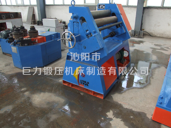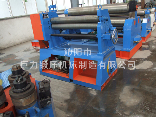 三輥非對(duì)稱式卷板機(jī)結(jié)構(gòu)形式為三輥非對(duì)稱式,上輥為主傳動(dòng)輥,在兩下輥中央對(duì)稱位置作垂直升降運(yùn)動(dòng),通過(guò)液壓缸內(nèi)的液壓油作用子活塞而獲得,為液壓傳動(dòng);兩下輥體旋轉(zhuǎn)運(yùn)動(dòng),通過(guò)減速機(jī)的輸出齒輪與下輥齒輪齒合,為卷制板材提供扭力,同時(shí)作為主傳動(dòng);邊輥?zhàn)鲀A斜升降運(yùn)動(dòng),具有預(yù)彎和卷圓雙重功能,結(jié)構(gòu)緊湊,操作維修方便。